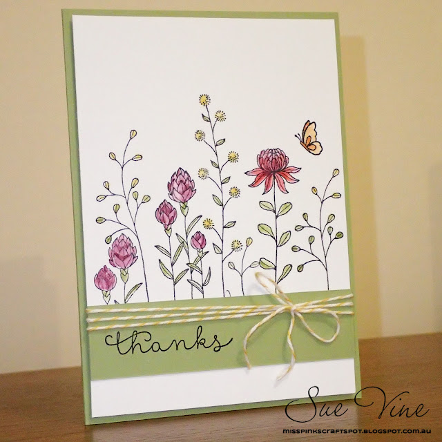 I stamped in Basic Black then used Aqua Painters to colour.I added a touch of Wink of Stella on the adorable little butterfly and some of the flowers - it's really difficult to get a good photo, it looks stunning in the flesh!